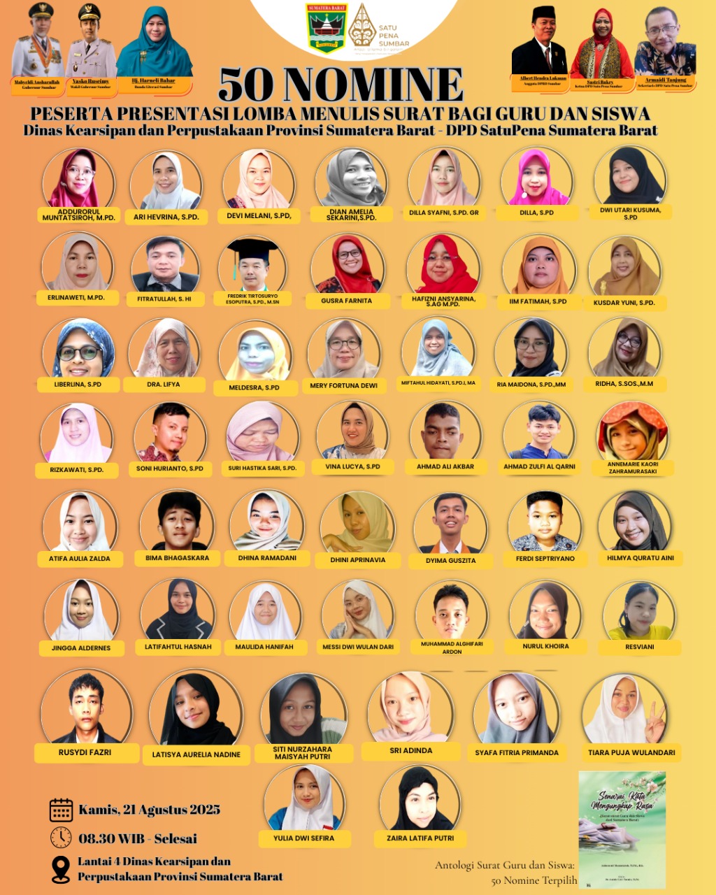Padang, majalahintrust.com – Sebanyak 50 orang peserta Lomba Menulis Surat Guru dan Siswa se-Sumatera Barat 2025, Kamis (21/8/2025) besok mempresentasikan suratnya untuk meraih pemenang terbaik 1, 2, 3 dan lima harapan masing-masing kategori, guru dan siswa.