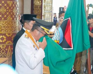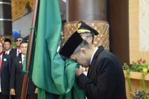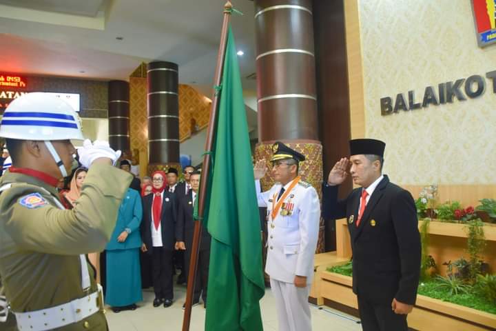 Keduanya secara bergantian mencium bendera pataka Pemko Padang disaksikan oleh semua pejabat utama Pemko Padang, serta Ketua TP-PKK Kota Padang Genny Hendri Septa, dan Ketua DWP Kota Padang Vanny Andree Algamar.