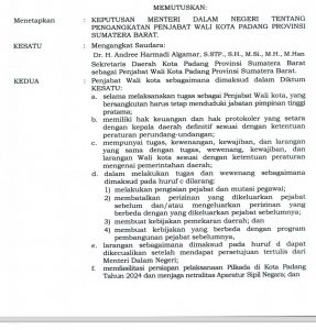 Dalam isi surat tersebut, Andree Algamar bakal menjabat orang nomor satu di Kota Padang selama satu tahun kedepan.