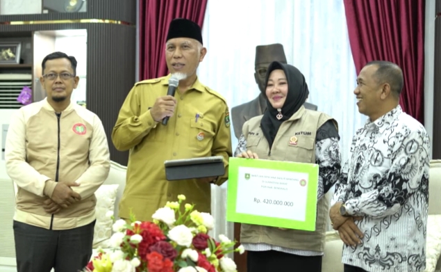 Padang, majalahintrust.com – Gubernur Sumatera Barat, Mahyeldi Ansharullah secara simbolis menerima bantuan kemanusiaan dari Persatuan Guru Republik Indonesia (PGRI) Kabupaten Bengkalis sebesar Rp420 juta di Istana Gubernur, Selasa (30/12/2025). Bantuan tersebut akan disalurkan kepada sekolah dan para guru di Sumbar yang terdampak bencana hidrometeorologi.