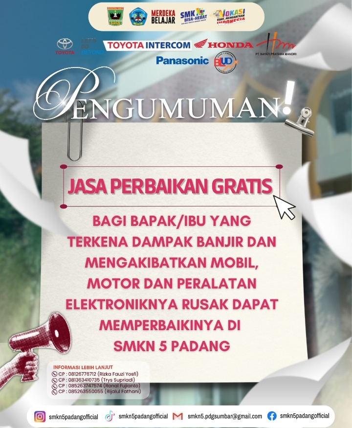 Padang, majalahintrust.com – Dinas Pendidikan Provinsi Sumatera Barat melalui SMKN 5 Padang membuka layanan jasa perbaikan gratis bagi masyarakat yang terdampak bencana banjir yang melanda sejumlah wilayah di Kota Padang dan sekitarnya. Jenis layanan yang diberikan mulai dari perbaikan kendaraan roda empat, roda dua dan berbagai peralatan elektronik.