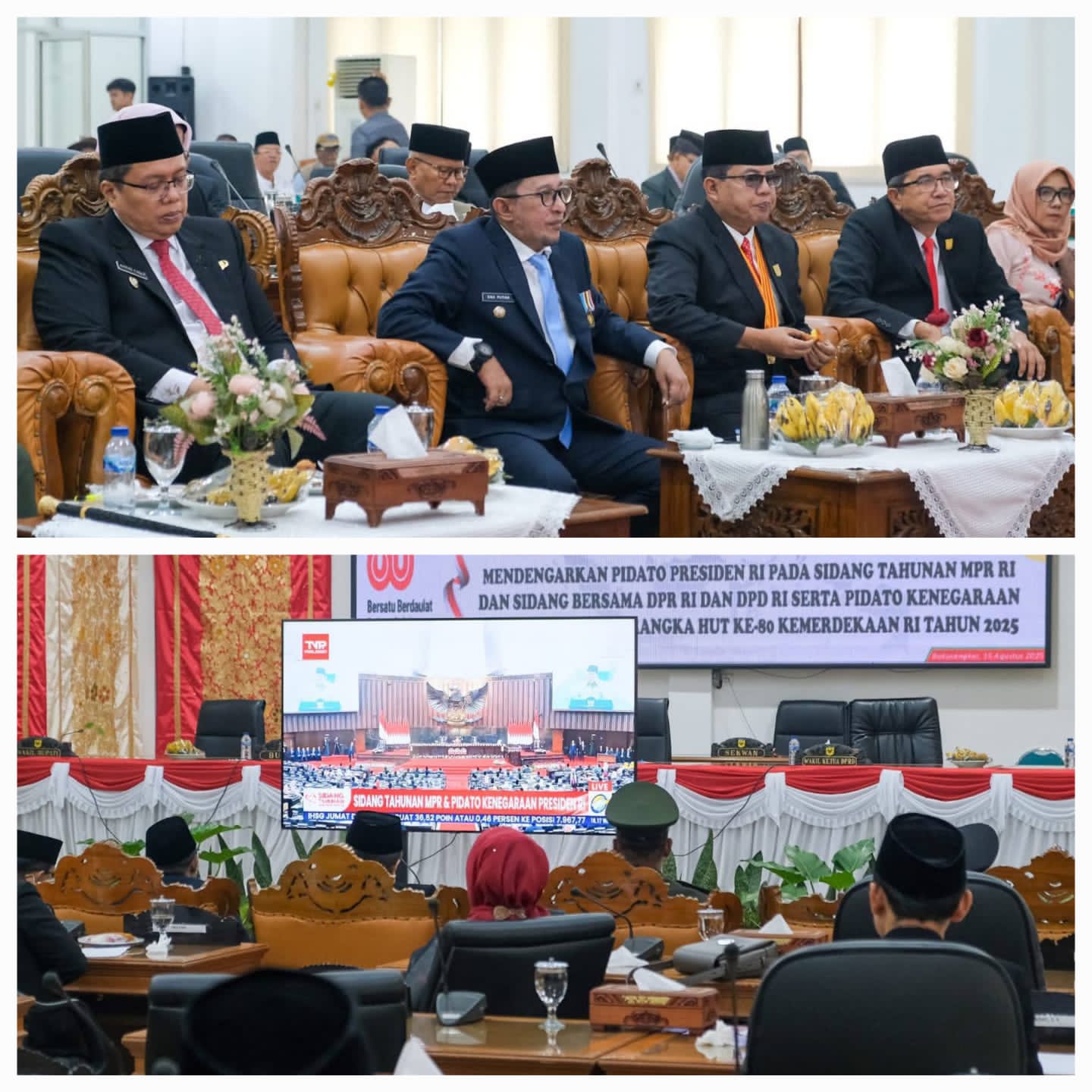 Melalui siaran langsung dari Jakarta, hadirin menyaksikan pembukaan Sidang Tahunan oleh Ketua MPR RI, dilanjutkan pidato pengantar Sidang Bersama oleh Ketua DPR RI Puan Maharani, sebelum Presiden Prabowo Subianto menyampaikan pidato kenegaraan perdananya.