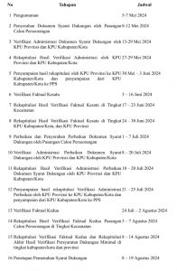 Dirinya juga menyampaikan, bakal pasangan calon perseorangan yang telah ditetapkan memenuhi syarat dukungan, bisa mendaftarkan diri ke KPU Provinsi Sumatera Barat pada tanggal 27-29 Agustus 2024 pada jadwal yang sama dengan pendaftaran bakal pasangan calon dari partai politik atau gabungan partai politik.