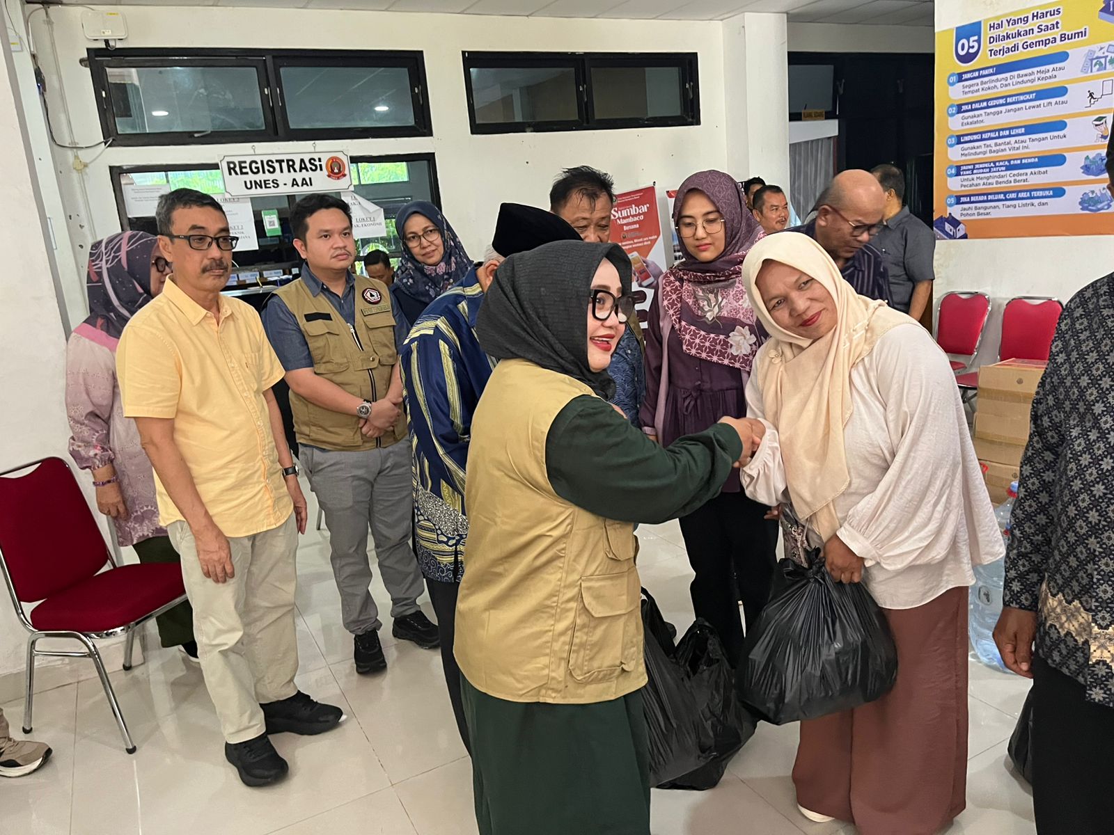 Pembina Yayasan Perguruan Tinggi Padang (YPTP) Prof.Dr Andi Suryaman Mustari Pide SH,MH didampingi Ketua Yayasan Dr Andi Syahrum Makkurade, Rektor Unes Prof.Dr Syufyarma Marsyidin S.Pd,M.Pd serta Sekretaris KKS Sumbar Mahmud R Bara menyerahkan bantuan kepada warga Kota Padang, Selasa (16/12/2025),