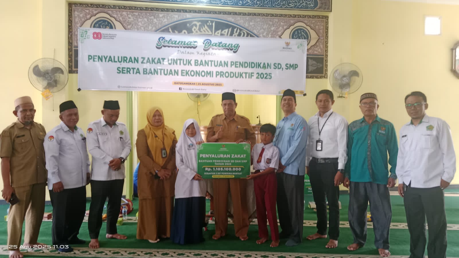 Penyerahan simbolis dilaksanakan di Masjid Nurul Falah, Kecamatan Lima Kaum, diwakili oleh Staf Ahli Bupati Tanah Datar Drs. Erizanur, M.Si, dan dihadiri oleh Ketua Baznas Tanah Datar Dr. Yasmansyah, M.Pd, Kabid SMP Dinas Pendidikan, Camat Lima Kaum, serta ratusan siswa dan guru SD se-Kecamatan Lima Kaum.