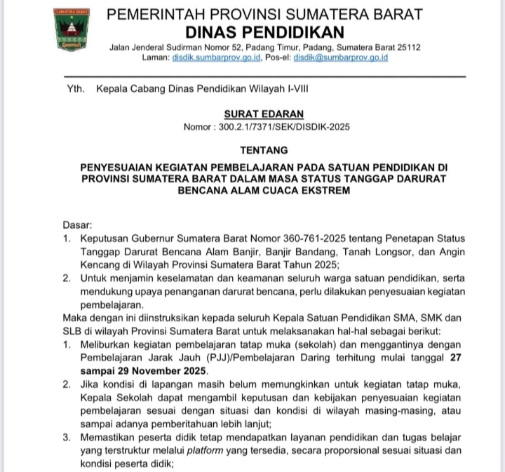 Sementara itu, Kepala Dinas Pendidikan Sumbar, Habibul Fuadi menjelaskan bahwa Surat Edaran Nomor 300.2.1/7371/SEK/DISDIK-2025 telah diteruskan kepada seluruh kepala satuan pendidikan SMA, SMK, dan SLB melalui cabang dinas masing-masing.
