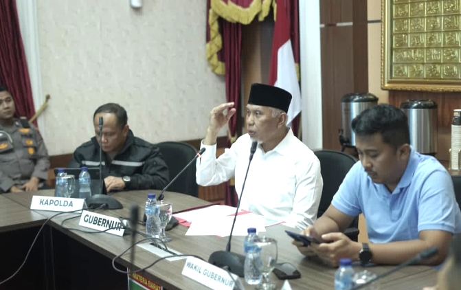 Padang, majalahintrust.com – Gubernur Sumatera Barat, Mahyeldi Ansharullah didampingi Wakil Gubernur, Vasko Ruseimy menggelar rapat bersama unsur Forkopimda Sumbar di Istana Gubernur, Jumat malam (28/11/2025). Pembukaan akses darurat dan penyeragaman data penanganan bencana menjadi fokus utama pembahasan.