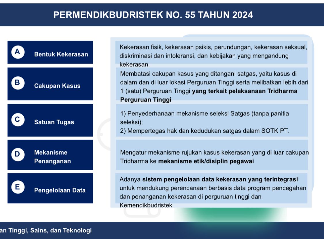 Lindung Saut Maruli Sirait memaparkan, ada berbagai bentuk kekerasan yang terjadi di kampus, yang terbagi pada beberapa kategori sesuai dengan Permendikbudristek Nomor 55 Tahun 2024. Ada kekerasan fisik, kekerasan psikis, perundungan, kekerasan seksual, diskriminasi, intoleransi, dan kebijakan yang mengandung kekerasan.