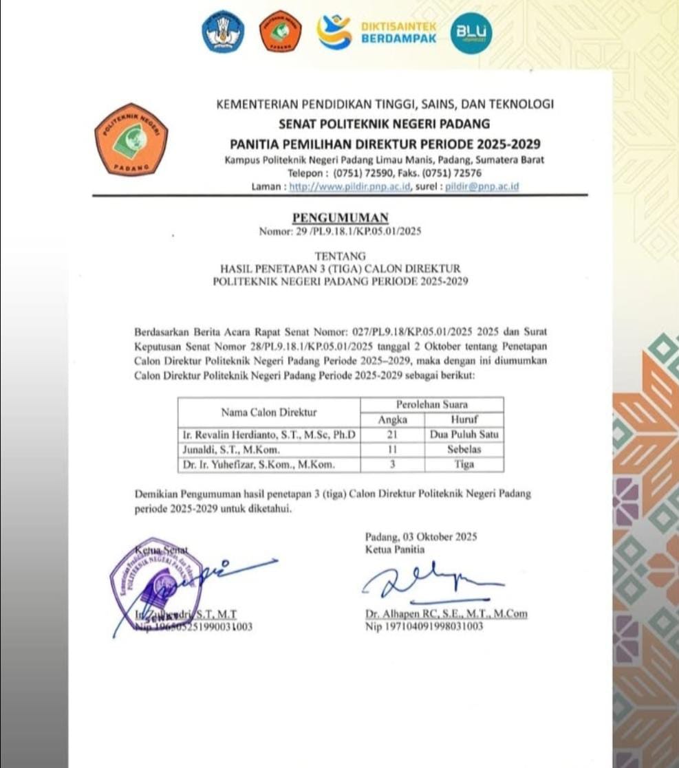 Padang – Panitia Pemilihan Direktur Politeknik Negeri Padang (PNP) periode 2025–2029 resmi mengumumkan tiga nama calon direktur yang berhasil lolos setelah melalui tahapan penyaringan di tingkat Senat PNP, Jumat (3/10).