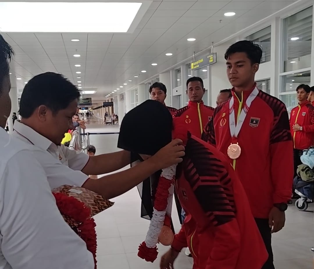 Kepulangan duta olahraga Ranah Minang langsung disambut Ketua Umum KONI Sumbar Hamdanus dan Waketum I Septri, di Bandara Internasional Minangkabau (BIM), Kamis (16/10/2025)