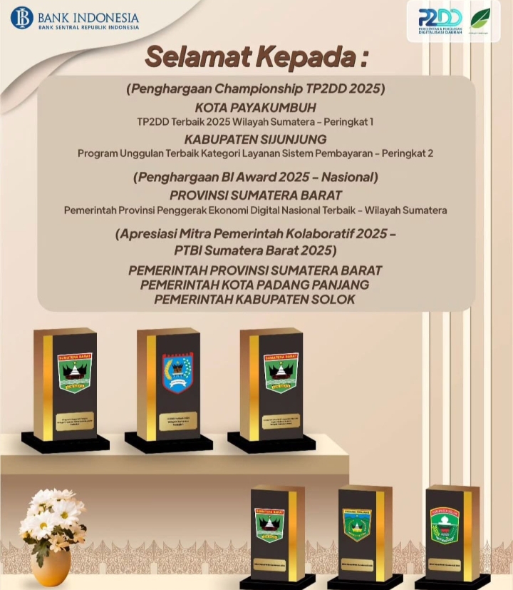 Dalam ajang Bank Indonesia Award 2025, Pemprov Sumbar berhasil meraih penghargaan tingkat nasional sebagai Pemerintah Provinsi Penggerak Ekonomi Digital Nasional Terbaik Wilayah Sumatera. Sementara itu, dalam ajang Championship TP2DD 2025, Pemerintah Kota Payakumbuh mencatatkan prestasi sebagai peringkat pertama TP2DD terbaik wilayah Sumatera, disusul Kabupaten Sijunjung sebagai peringkat kedua terbaik kategori layanan sistem pembayaran.