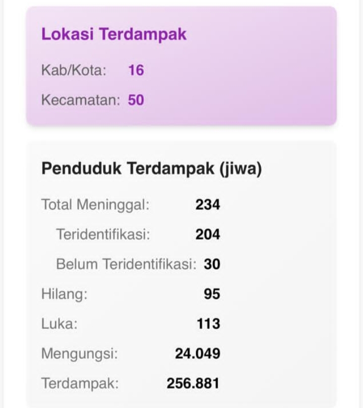 Sementara jumlah total masyarakat terdampak sebanyak 256.881 jiwa. Dari jumlah tersebut, mengungsi sebanyak 24.049 orang, luka-luka sebanyak 113 orang, dan 95 orang lainnya hilang, serta 234 orang meninggal dunia.