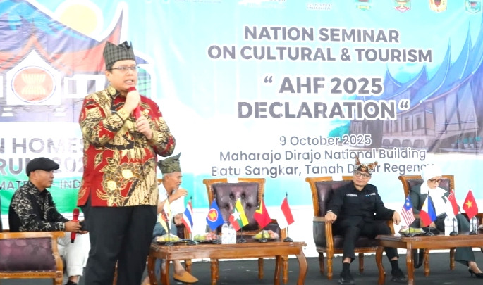 Tanah Datar, majalahintrust.com – Wakil Bupati (Wabup) Tanah Datar Ahmad Fadly S.Psi, memberikan apresiasi atas pelaksanaan Nation Seminar On Cultural and Tourism “Asean Homestay Forum (AHF) 2025 Declaration” di Tanah Datar di Gedung Maharajo Dirajo Batusangkar, Kamis (09/10/2025).